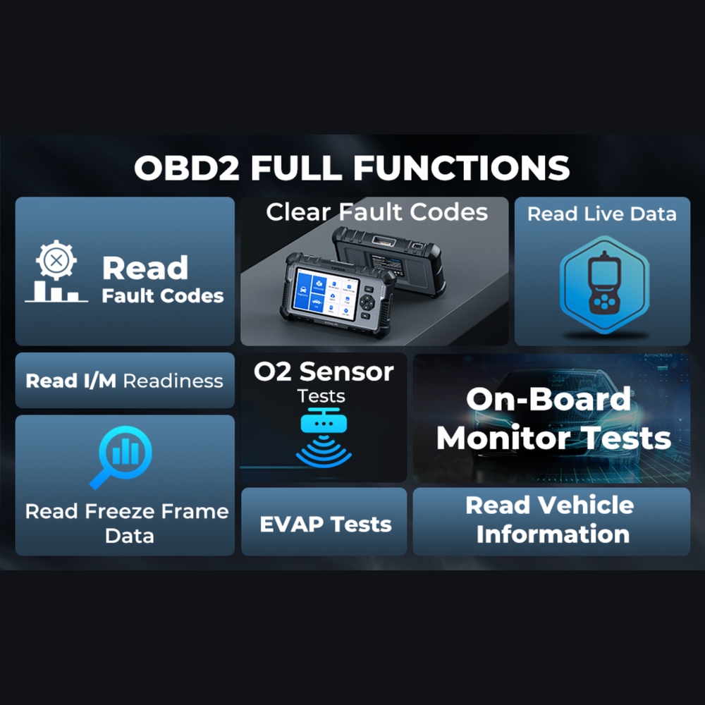 - Full OBD2 Functionality (10 Modes) – Supports complete OBDII services including live data, freeze frame, I/M readiness, O2 sensor test, EVAP test, and onboard monitor testing.
