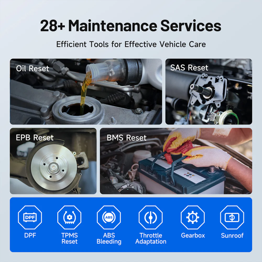 - 28+ Advanced Service Functions – Perform essential maintenance procedures including Oil Reset, EPB Reset, SAS Calibration, DPF Regeneration, Injector Coding, TPMS Reset, ABS Bleeding, BMS Registration, Throttle Adaptation, and more.