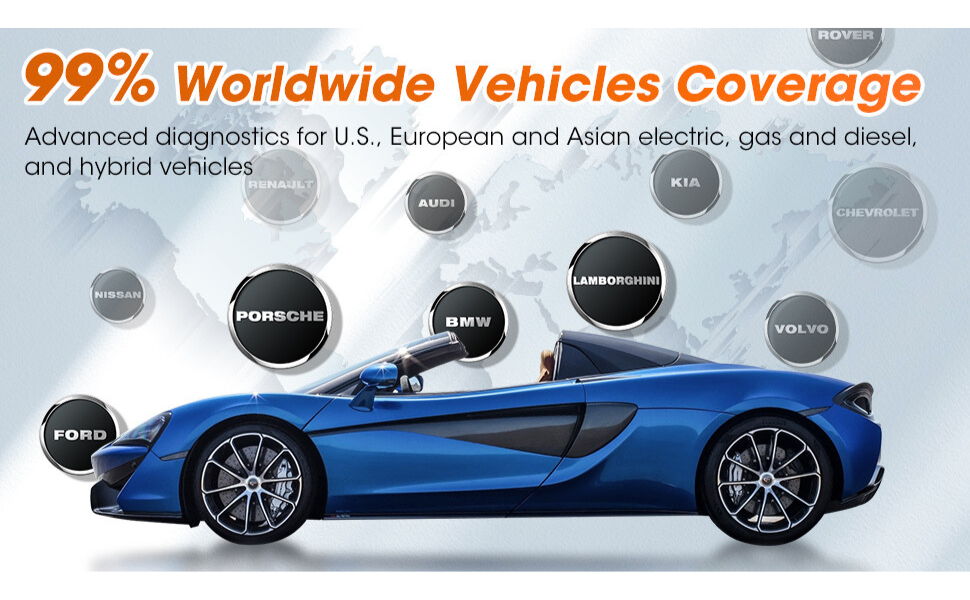 Compatible with over 99% of vehicles worldwide, the Autel MaxiSys MS909EV supports advanced diagnostics across U.S., European, and Asian models — including electric, hybrid, gasoline, and diesel vehicles. Trusted by professionals for brands such as Rover, Renault, Audi, Kia, Chevrolet, Nissan, Porsche, BMW, Lamborghini, Volvo, and Ford, ensuring comprehensive coverage and reliable performance in every workshop.