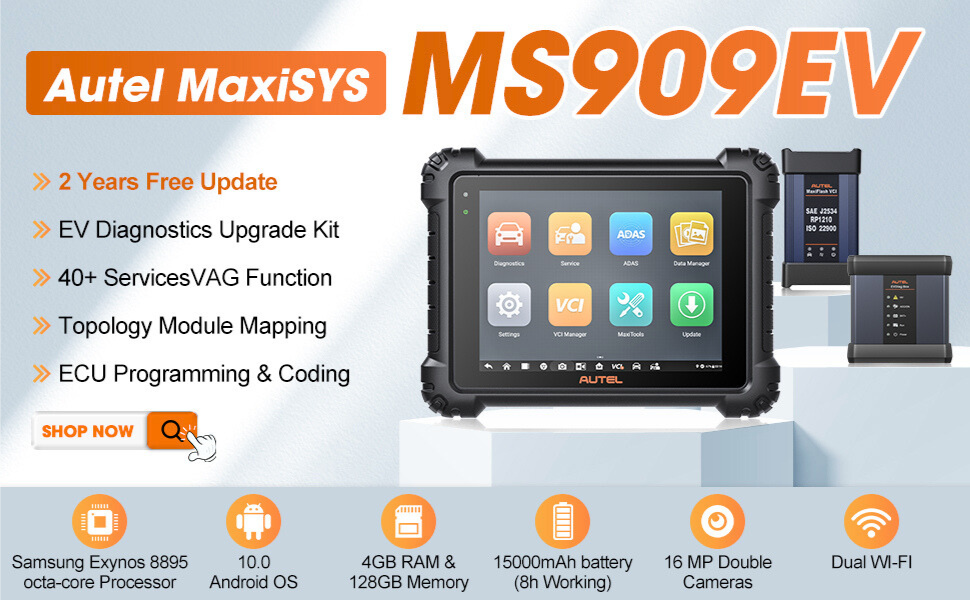 The Autel MaxiSys MS909EV is a cutting-edge EV diagnostic tablet designed for professional technicians. Featuring a powerful Samsung Exynos 8895 octa-core processor, Android 10.0 OS, and 4GB RAM, it delivers seamless performance for electric, hybrid, and conventional vehicles. Includes 2 years of free updates, 40+ service functions, topology mapping, and advanced ECU programming.