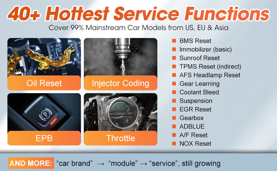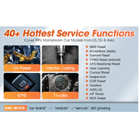 The Autel MaxiSys MS909EV offers over 40 essential service and maintenance functions, covering 99% of U.S., European, and Asian vehicles. From Oil Reset, Injector Coding, and Throttle Adaptation to advanced features like EPB, BMS, TPMS, Gear Learning, and ADBLUE reset, it delivers full support for daily workshop needs. Constant updates ensure compatibility with the latest vehicle systems.