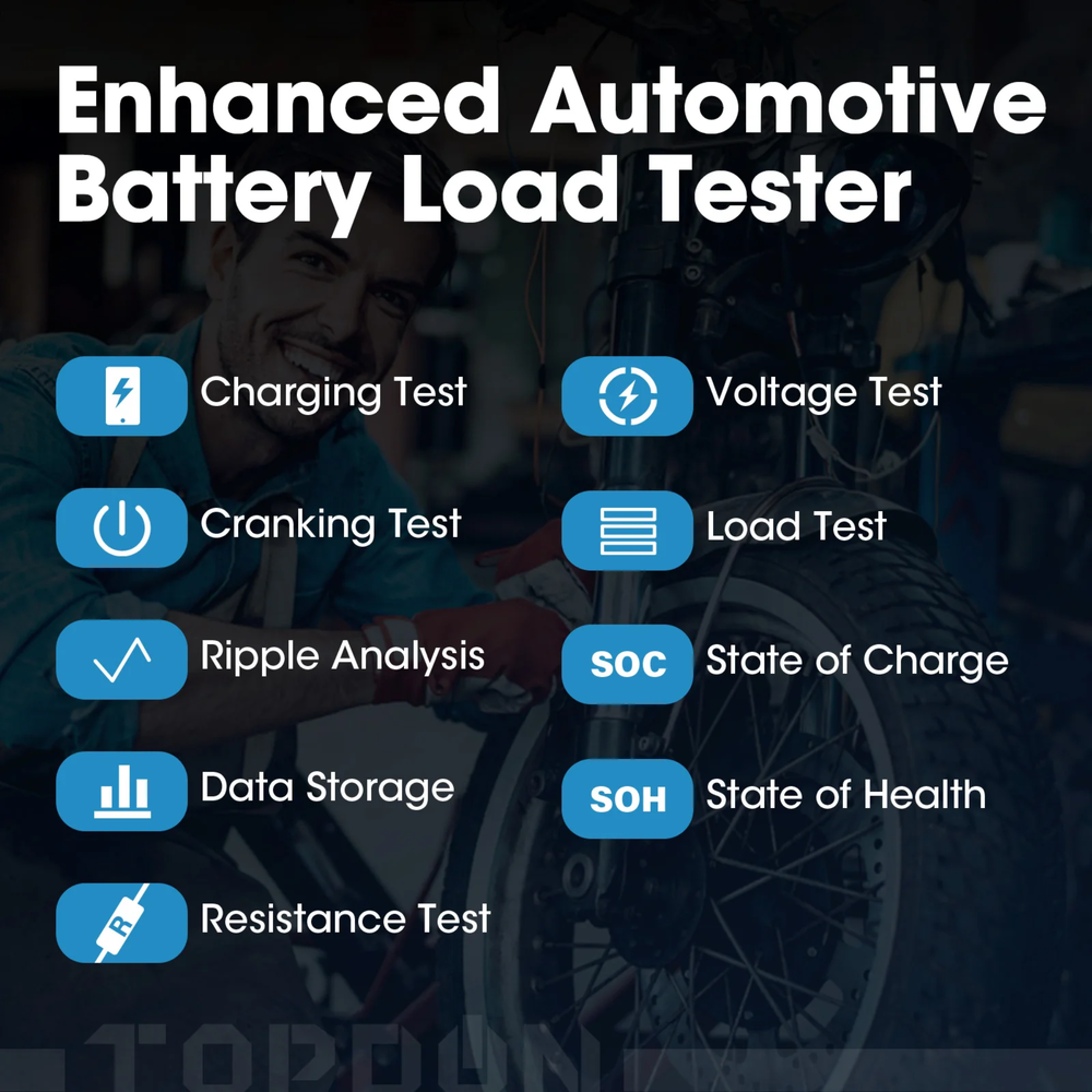 - Comprehensive Battery Diagnostics – Performs full battery evaluation including voltage, CCA testing, State of Health (SOH), and State of Charge (SOC) to determine real battery condition.