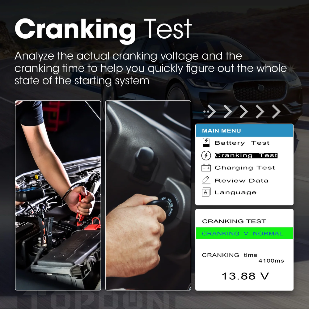 - Advanced Cranking Test – Analyzes voltage drop during engine startup to confirm starting reliability and detect early battery weakness.