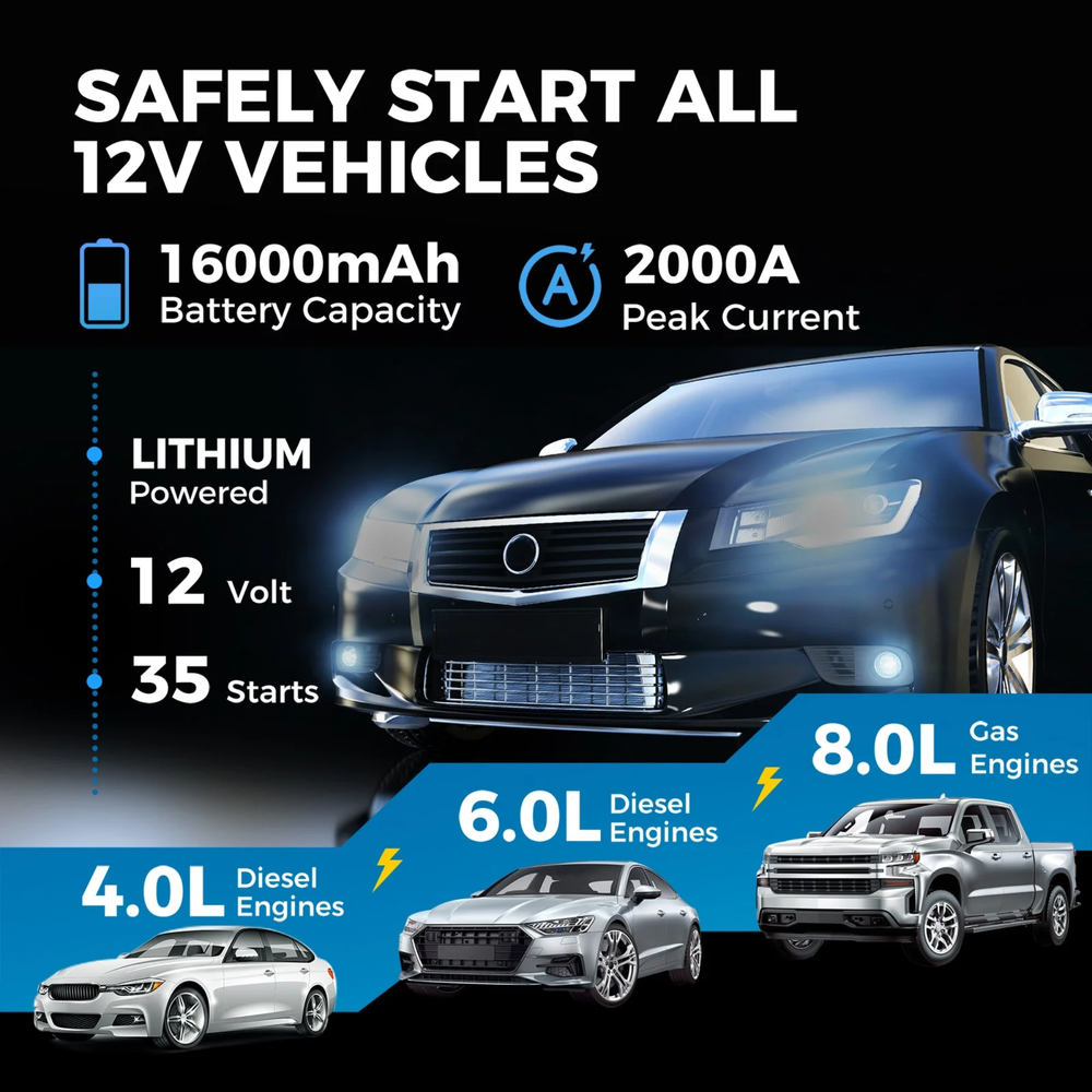 | High-capacity 16000mAh lithium battery for up to 35 jump starts per charge |