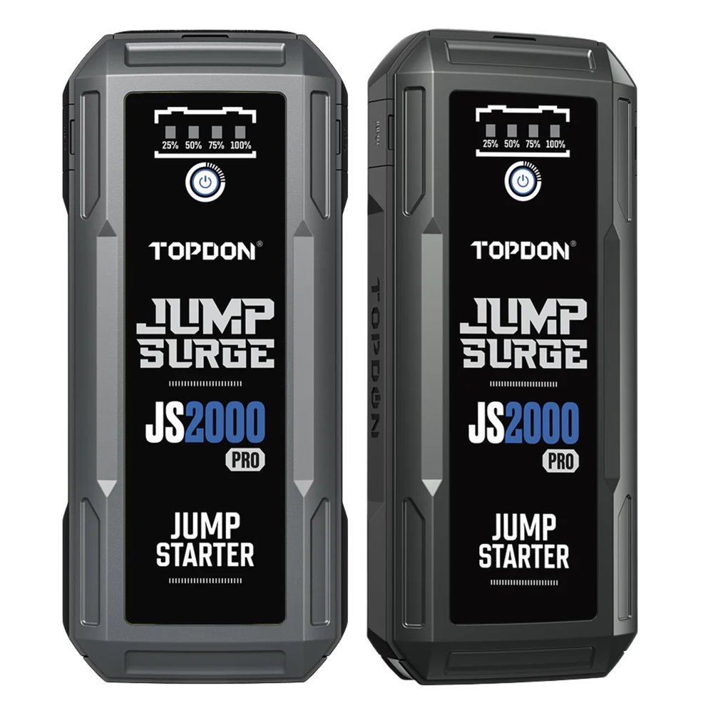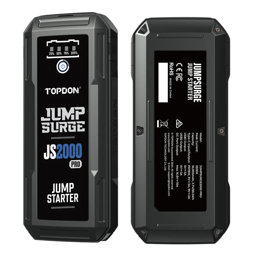 The TOPDON JumpSurge2000Pro is a professional-grade portable jump starter engineered for modern automotive reliability and emergency preparedness. Delivering a powerful 2500A peak current with a high-capacity 16000mAh lithium battery, it safely jump-starts 12V vehicles including gasoline engines up to 8L and diesel engines up to 6L. Designed for technicians, fleet operators, and everyday drivers, it combines rapid starting performance, advanced safety protections, fast device charging, and integrated emergency lighting in one compact automotive power solution.