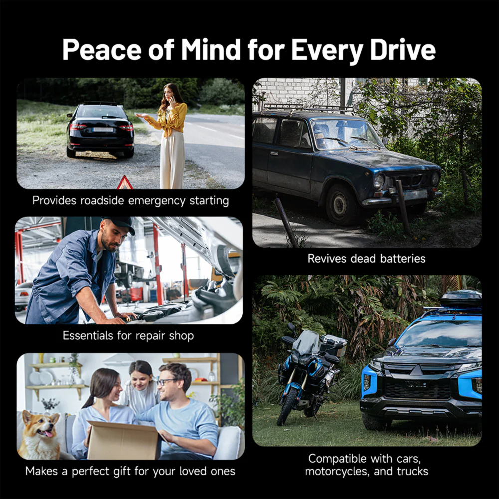 - Wide Vehicle Compatibility Coverage – Designed for cars, SUVs, trucks, pickups, RVs, motorcycles, tractors, and other 12V vehicles requiring reliable portable starting power.