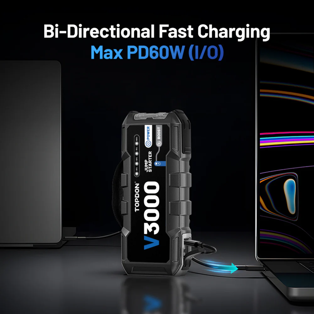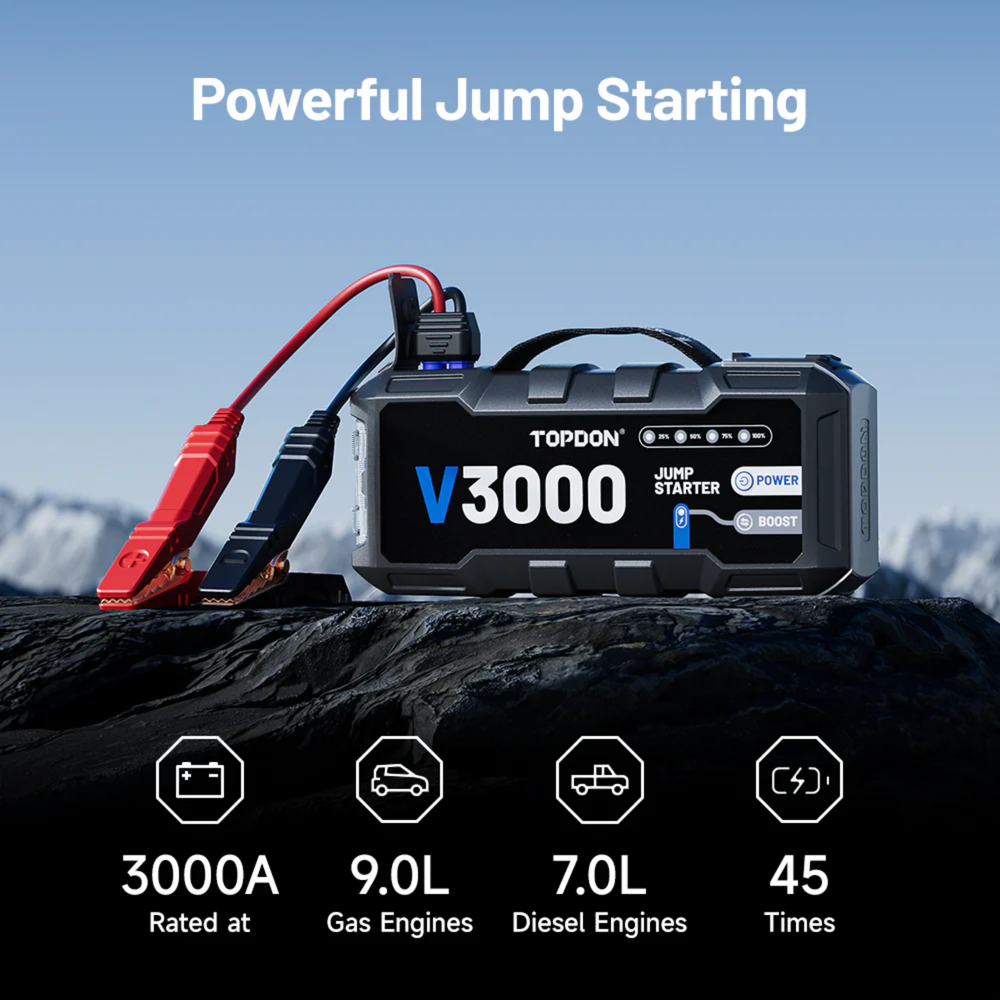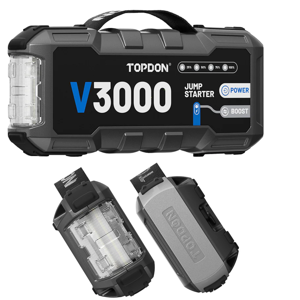 The TOPDON V3000 is a high-performance portable jump starter engineered for professional automotive reliability and emergency readiness. Delivering 3000 peak amps, it instantly starts 12V vehicles including cars, SUVs, trucks, and RVs with engines up to 9.0L gas and 7.0L diesel. Designed with advanced safety protection, fast charging capability, and multi-function power output, the V3000 combines jump-starting power with portable energy supply functionality. Its rugged, compact construction and intelligent operation make it an essential tool for workshops, fleet operators, and everyday drivers.